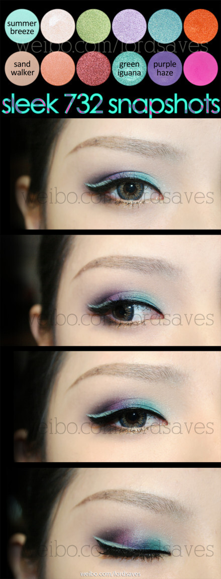#眼妆分享#Sleek 732 snapshots,这盘粉质挺好的~用了五个颜色,四个已经在盘子上标注好了,另外一个哑光黑是其他盘子里随便抓的,这回犯懒,画法神马的大家自己点击大图查看吧眼线液是stila的薄荷绿眼线液,美瞳是dueba的来自@lovecon美瞳网