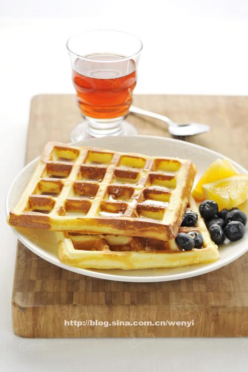 【蜂蜜松饼】原料:低筋面粉185克泡打粉1/2匙盐1/4勺鸡蛋2个细砂糖2汤匙牛奶250ml黄油90克配料:橙子半个蓝莓约10个蜂蜜1汤匙(15ml)做法:1)把低筋面粉,泡打粉和盐混合均匀备用2)把蛋白和蛋黄分离开,先将蛋黄打散,然后一边加入牛奶一边搅拌均匀3)将黄油隔热水融化成液态,加入牛奶和蛋黄糊中,边倒边用手动打蛋器搅匀4)然后将之前的面粉混合物用面粉筛筛入,用手动打蛋器混合均匀备用5)将蛋白从冷藏室取出,分三次加入细砂糖,搅打至捞起蛋白能看到直立略弯的尖6)将面糊倒入平底锅中,稍平整一下表面。盖上盖子,几分钟后取出松饼,配以新鲜水果和蜂蜜食用