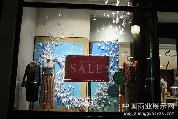 2013年伦敦Anthropologie橱窗设计以蓝天为背景,别具新意地用剪纸营造出一群白鸟冲上蓝天的创意理念,独特的造型使得整个橱窗充满艺术美感。而相对清新淡雅的背景突兀出展示主题——服饰。