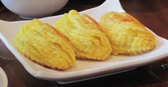 【飘香榴莲酥】做法:1.榴莲去壳去籽,粉碎,加入粟粉,奶粉蒸熟;2.酥皮制作,皮包油对折开333叠起入冰箱冷冻;3.开好的酥皮切薄片,包入榴莲馅入180度油温炸制金黄色即可。