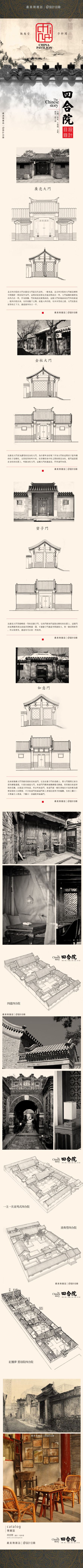 北京四合院 | 由正房、倒座、東廂房和西廂房圍合成一個口字形,中間是一個庭院。從擇地、定位到確定建築的尺度都極講究風水。其大門以廣亮大門最具代表性。更為講究的是金柱大門。徜徉在北京的胡同,兩側大門緊閉,一枝出墙的榴花,剥落的歲月,还有头頂呼呼的鸽子哨,這種寧靜的的京味兒,我有多爱。 建築布局| 由四面房屋固合起一個庭院,為一進院,兩個院落為兩進院,三個為三進院,依此類推。二進院:宅門在東南角上,迎面是影壁墻,向西為前院,前院南側為倒座房,舊時作客房、雜用間。自垂花門進後院,後院的正房是長輩居住,正房左右附耳房或小跨院為廚房、雜屋、廁所,院內東西廂房是晚輩住處。