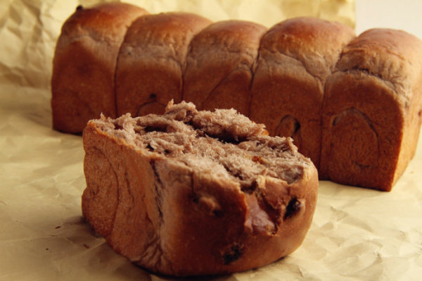[自制唯美浪漫红酒巧克力吐司] 巧克力红酒面包总重2300g,每个1000g,可做2个。【材料配方】高筋面粉:………… 1000g(100%)砂糖: ………… 200g (20%)盐: ………… 8g (0.8%)干酵母: ………… 15g (1.5%)鸡蛋: ………… 100g (10%)烫种: ………… 100g (10%)可可粉: ………… 30g (3%)红酒: ………… 650g (65%)黄油: ………… 100g (10%)葡萄干: ………… 200g