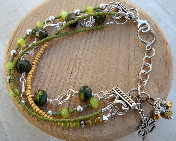 Multi Strand Bracelet - One Strand Wire Wrapped in Sterling, Two Strung - In shades of Green and yellow Czech Beads on Etsy, $37.99