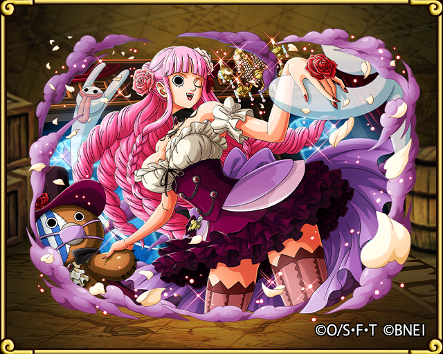 【"幽灵公主"佩罗娜】 佩罗娜是王下七武海月光·莫利亚的干部之一、恐怖咆哮三怪人之一、动物僵尸与吓人僵尸的指挥官。两年后为索隆送行,继续与鹰眼米霍克一起在克拉伊咖那岛居住。容貌是个可爱的公主,特征是头戴皇冠,粉红色双马尾发形,手上经常拿着一把酒红色的伞,独特笑声是“呵啦呵啦呵啦……”。