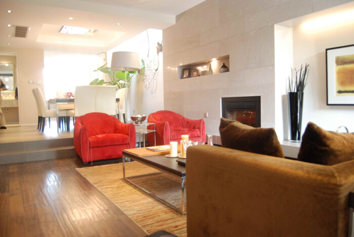 贝尔地板分享:白净石材的轻盈氛围中,透过家具的跳色对比,沉稳中散发过人品味。