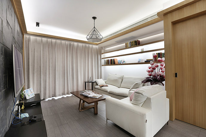 贝尔地板:透过深色线条勾勒出画面变化,展示柜轻巧悬空,是房内的一大亮点。