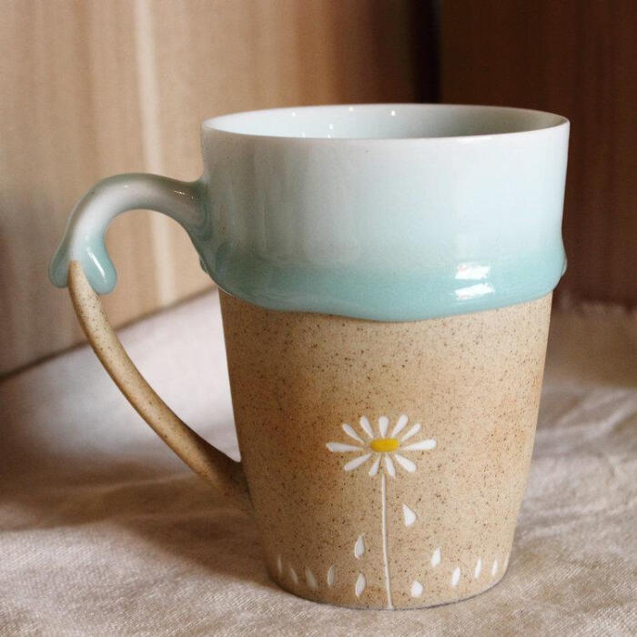 创意雕刻雏菊水杯陶艺手绘陶瓷马克杯磨砂大把手简约青釉礼物定制