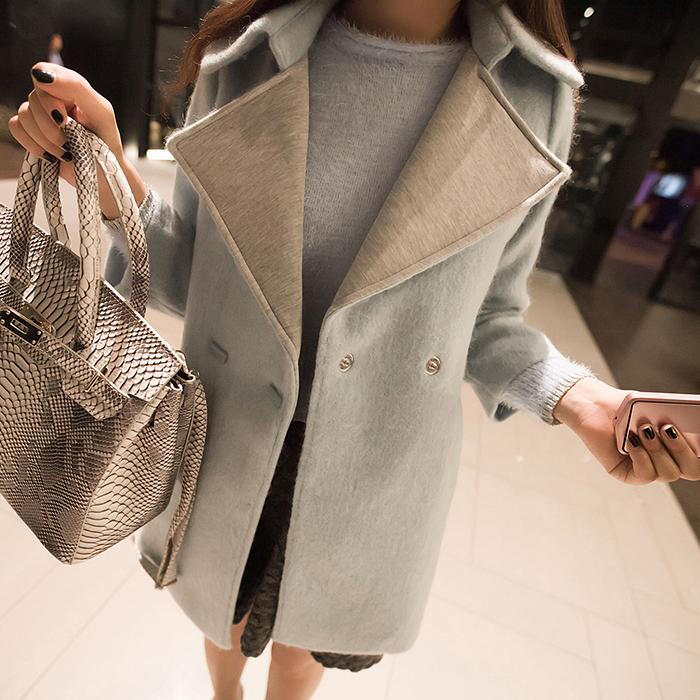 西草儿韩版高端大翻领宽松毛呢外套一粒扣九分袖女秋冬中长款