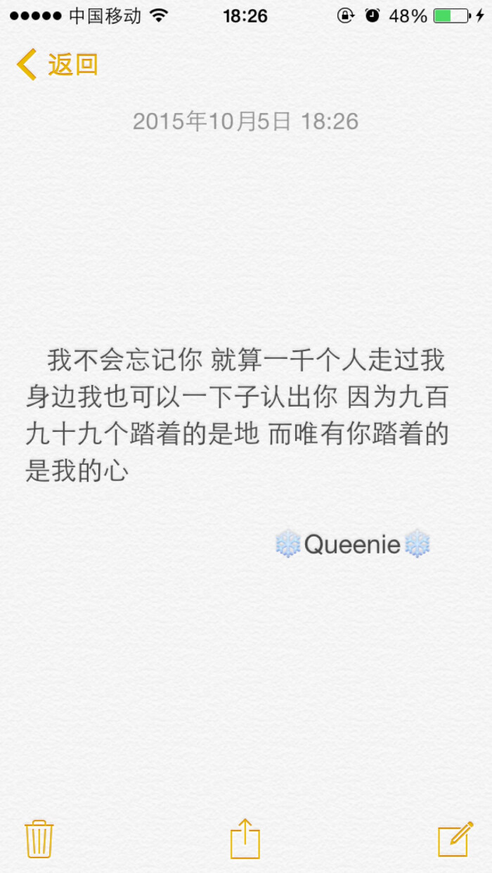 备忘录✨不会忘记你 就算一千个人走过我身边我也可以一下子认出你 因为九百九十九个踏着的是地 而唯有你踏着的是我的心