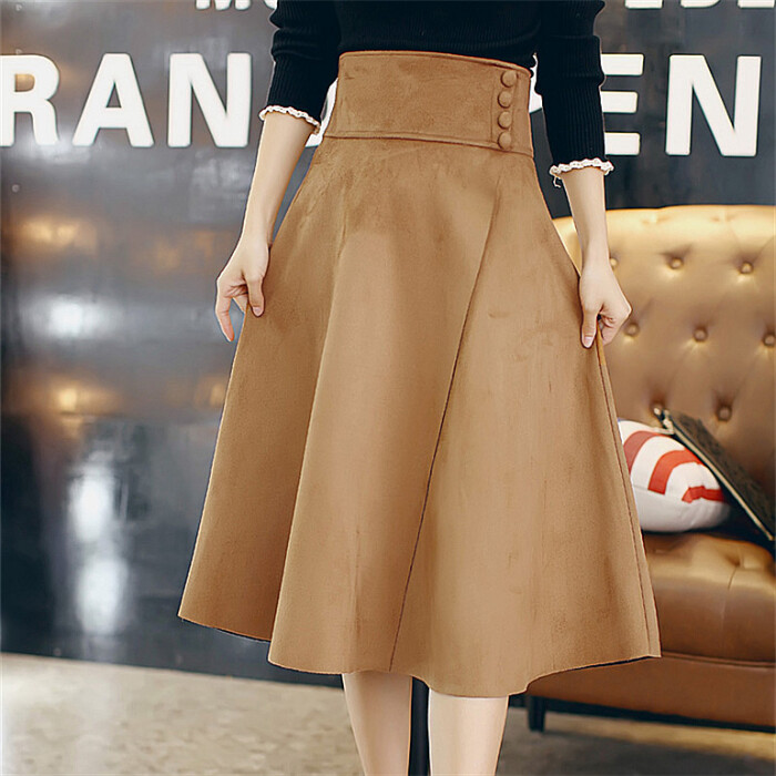 韩版秋冬高腰复古文艺大摆伞裙鹿绒皮A字半身裙中长款裙子女