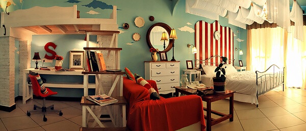 房屋是顶楼异形的房型,所以我们将这个区域做成了衣帽间,有足够的空间收纳房主的衣物;再放置一个沙发床,人多的时候还能充当卧室使用。
