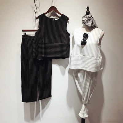 2016夏季新款 韩版条纹休闲套装 阔腿裤