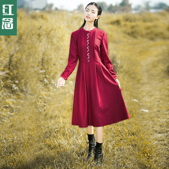 红念红色连衣裙长袖 2016秋冬中长款显瘦毛呢A字裙文艺打底裙