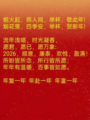 烟火起,照人间,举杯,敬此年! 烟花落,四季安,举杯,贺新年! 流年浅唱,时光凝香, 愿君,愿已,愿万象: 2026,顺意,康泰,欢悦,盈满! 所盼皆所念,所行皆所愿; 年年有温暖,百事皆如愿。 年复一年 年赴一年 年富一年