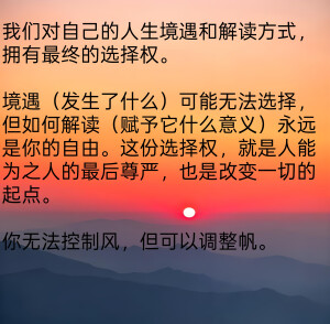 我们对自己的人生境遇和解读方式, 拥有最终的选择权。 境遇(发生了什么)可能无法选择,但如何解读(赋予它什么意义)永远是你的自由。这份选择权,就是人能为之人的最后尊严,也是改变一切的起点。 你无法控制风,但可以调整帆。
