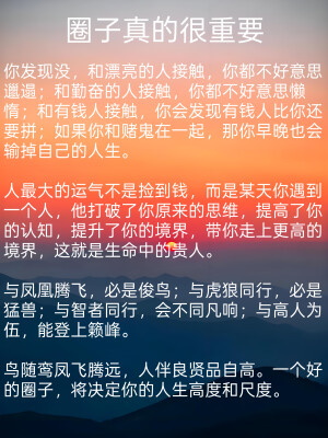 圈子真的很重要 你发现没,和漂亮的人接触,你都不好意思 邋遢;和勤奋的人接触,你都不好意思懒惰;和有钱人接触,你会发现有钱人比你还要拼;如果你和赌鬼在一起,那你早晚也会输掉自己的人生。 人最大的运气不是捡到钱,而是某天你遇到 一个人,他打破了你原来的思维,提高了你的认知,提升了你的境界,带你走上更高的境界,这就是生命中的贵人。 与凤凰腾飞,必是俊鸟;与虎狼同行,必是猛兽;与智者同行,会不同凡响;与高人为伍,能登上籁峰。 鸟随鸾凤飞腾远,人伴良贤品自高。一个好的圈子,将决定你的人生高度和尺度。